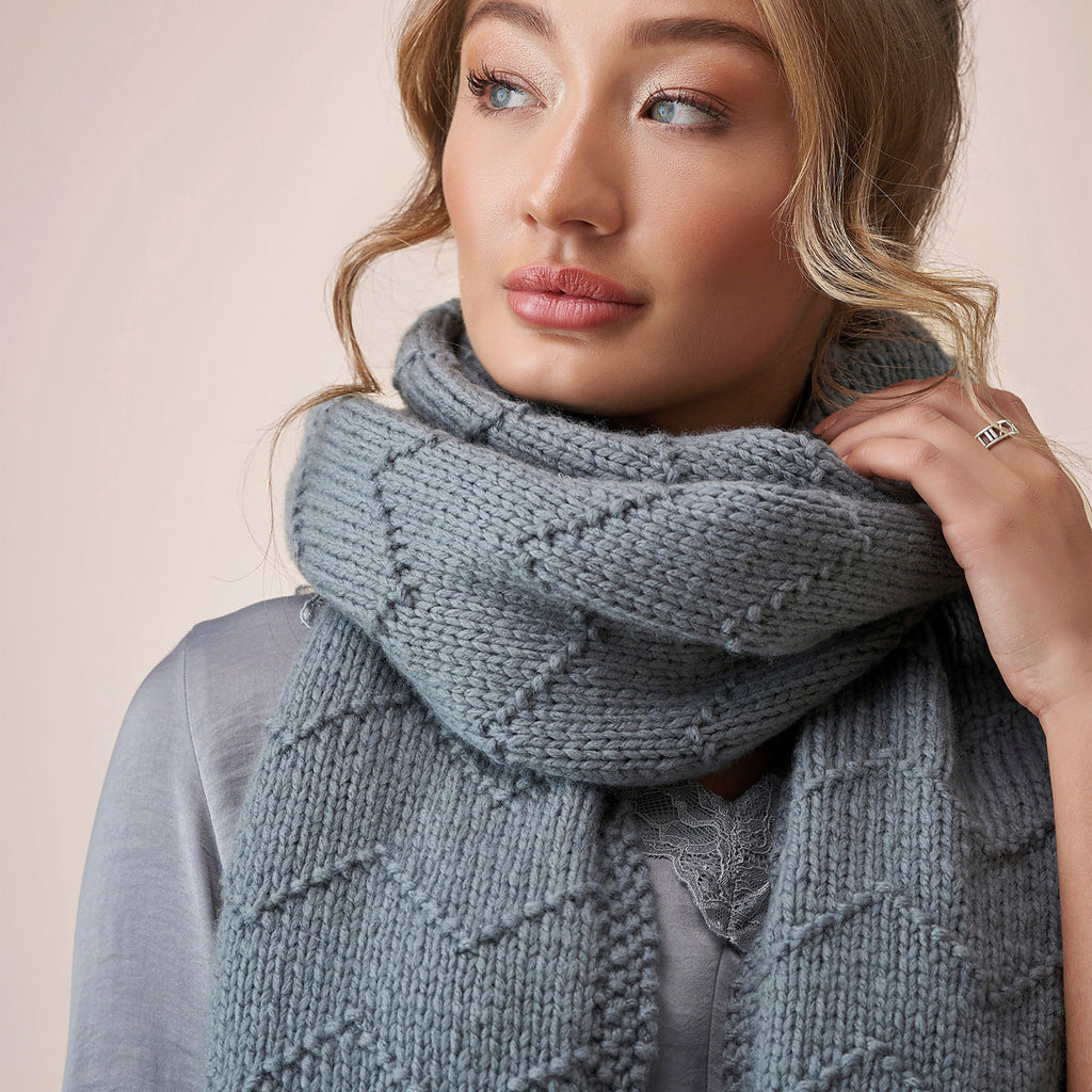 Knitted in Rowan Merino Aria — a lightweight, chunky yarn spun from 93% merino wool and 7% polyamide — this scarf is soft, warm and wonderfully airy. The clean, elegant design makes it a timeless winter staple you'll reach for again and again.